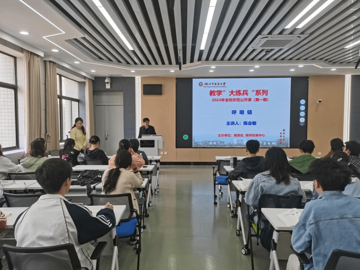 本网讯 3月21日,学校在黄家湖校区本草苑智慧教室Y102举办2024年首场教学“大练兵”示范公开课活动。本次活动由教务处、教师发展中心主办,通过线上直播与线下讲授相结合的方式进行。校党委常委曹继刚,教务处、教师发展中心、各学院相关负责人及教师代表300余人参加活动。