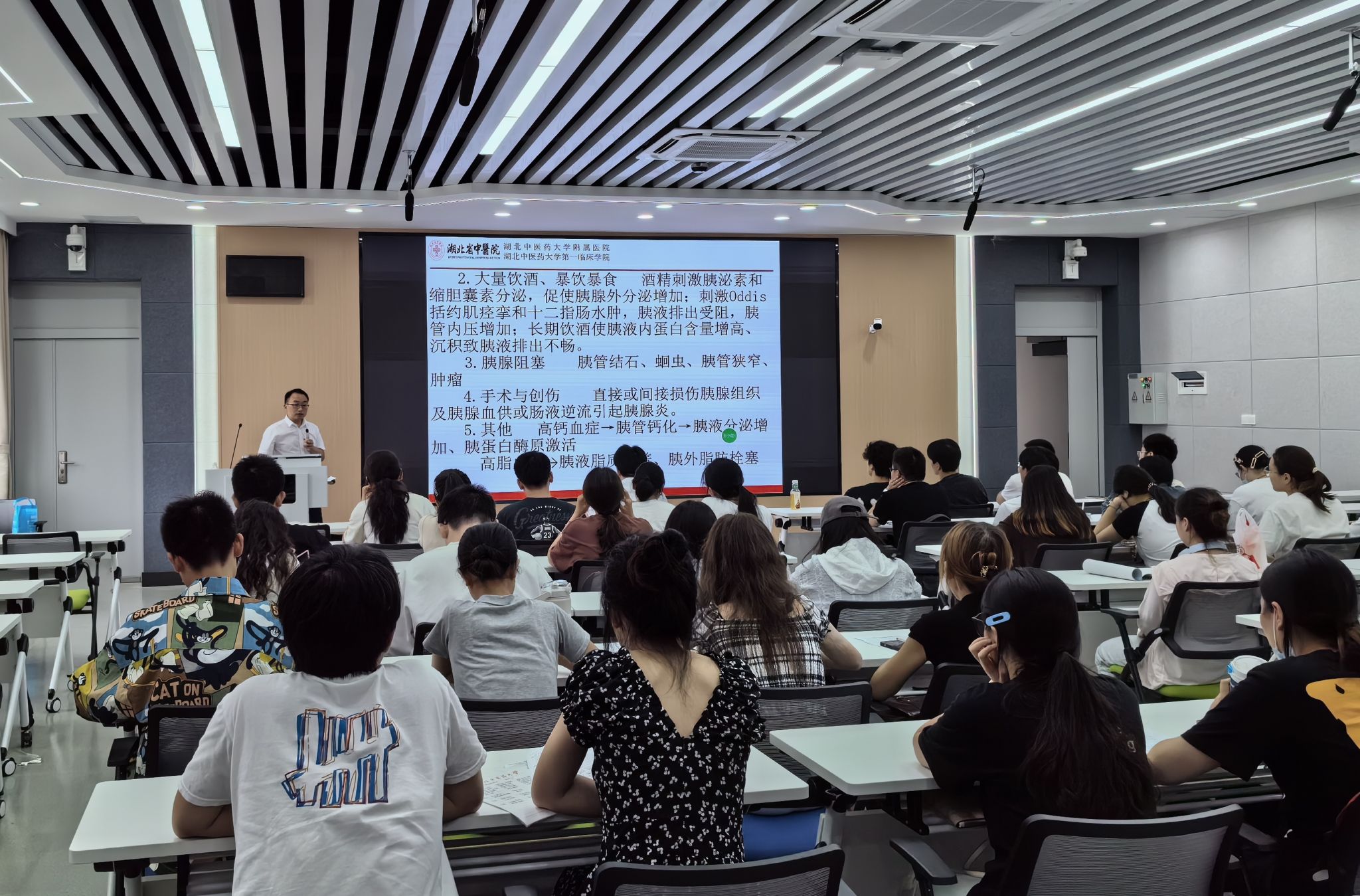 此次示范公开课内容为《重症急性胰腺炎》,由第一临床学院西医外科学教研室沈银峰教授讲授。沈银峰教授以“诸葛亮三气周瑜”的故事导入,介绍重症急性胰腺炎的临床特点,讲解中医情志也可致大病、重症。在回顾旧知环节,他通过模型演示、真实标本展示,逐步引导学生把握胰腺的解剖和生理特点,从知识记忆走向知识理解层次;在学习新知环节,通过临床病例与病理生理结合,深入浅出地讲解了重症急性胰腺炎的临床症状、实验室诊断、影像学诊断以及鉴别诊断;在学以致用环节,针对急性胰腺炎的治疗,重点讲解通里攻下法(伤寒论大承气汤)在急腹症治疗体系的国际地位,将中医伤寒论中的大承气汤系列融入到重症急性胰腺炎的治疗中,充分展现中医经典著作的当代价值,融合课程思政,培养“国之大者”情怀。