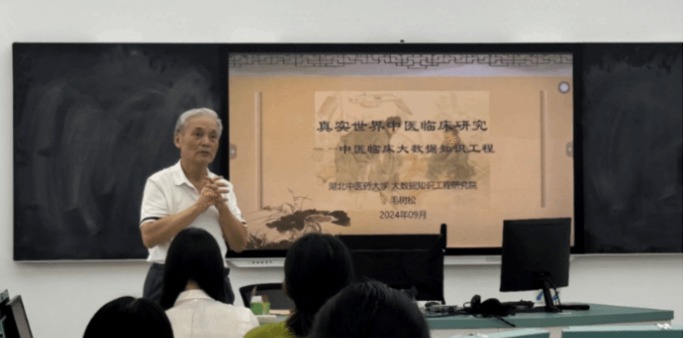 毛树松教授首先以“上六休一”的个人事迹引入,激励新生做科研要艰苦奋斗,脚踏实地。随后,他围绕信息技术、语言技术和应用、中医药的国际化、思想政治教育四个方面分享了自身从业六十余年的感悟,强调中医药翻译专业应与各类学科融合,要关注中医药发展前沿,推进中医药翻译语料库的创新模式建设。最后,毛树松教授向同学们提出三点要求:一是加强对中医药整体知识体系、概念体系的理解。二是紧随时代步伐,了解现代高科技的发展趋势。三是积极关注国家大事,了解国家发展战略——发展高科技、高效能、高质量的新质生产力。