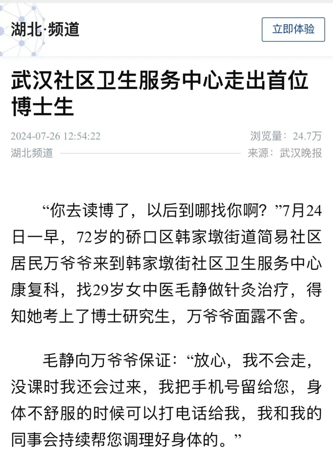 “想不到社区卫生服务中心还能培养出博士生。”得知毛静刚收到博士研究生录取通知书,这位患者笑着恭喜她,又打趣道:“上一秒还是硕士给我扎针灸,你这一跑回来,就是博士生给我扎针灸了咧。”
