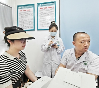 毛静(左)拿到录取通知书后继续接诊,患者祝贺她考博成功