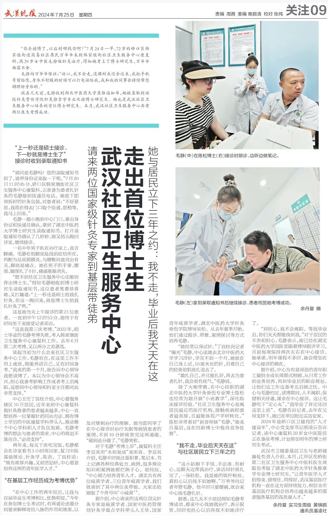 “你去读博了,以后到哪找你啊?”7月24日一早,72岁的社区居民万爷爷来到康复科,找毛静做针灸治疗,得知她考上了博士研究生,万爷爷面露不舍。