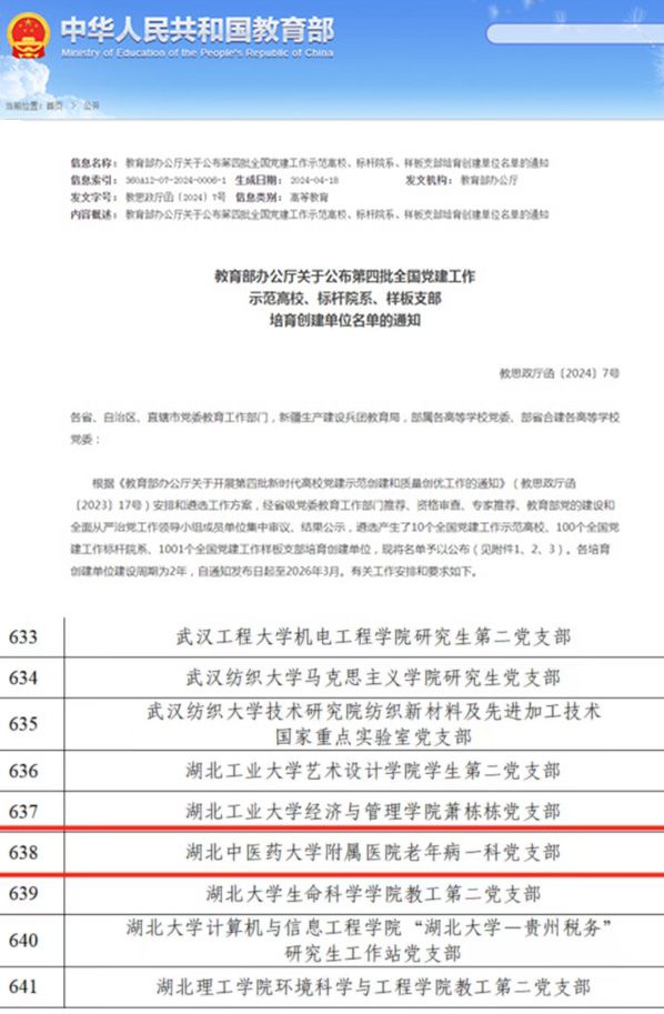 本网讯 近日,教育部办公厅公布第四批全国党建工作示范高校、标杆院系、样板支部培育创建单位名单。我校附属医院老年病一科党支部入选“全国党建工作样板支部”培育创建单位。