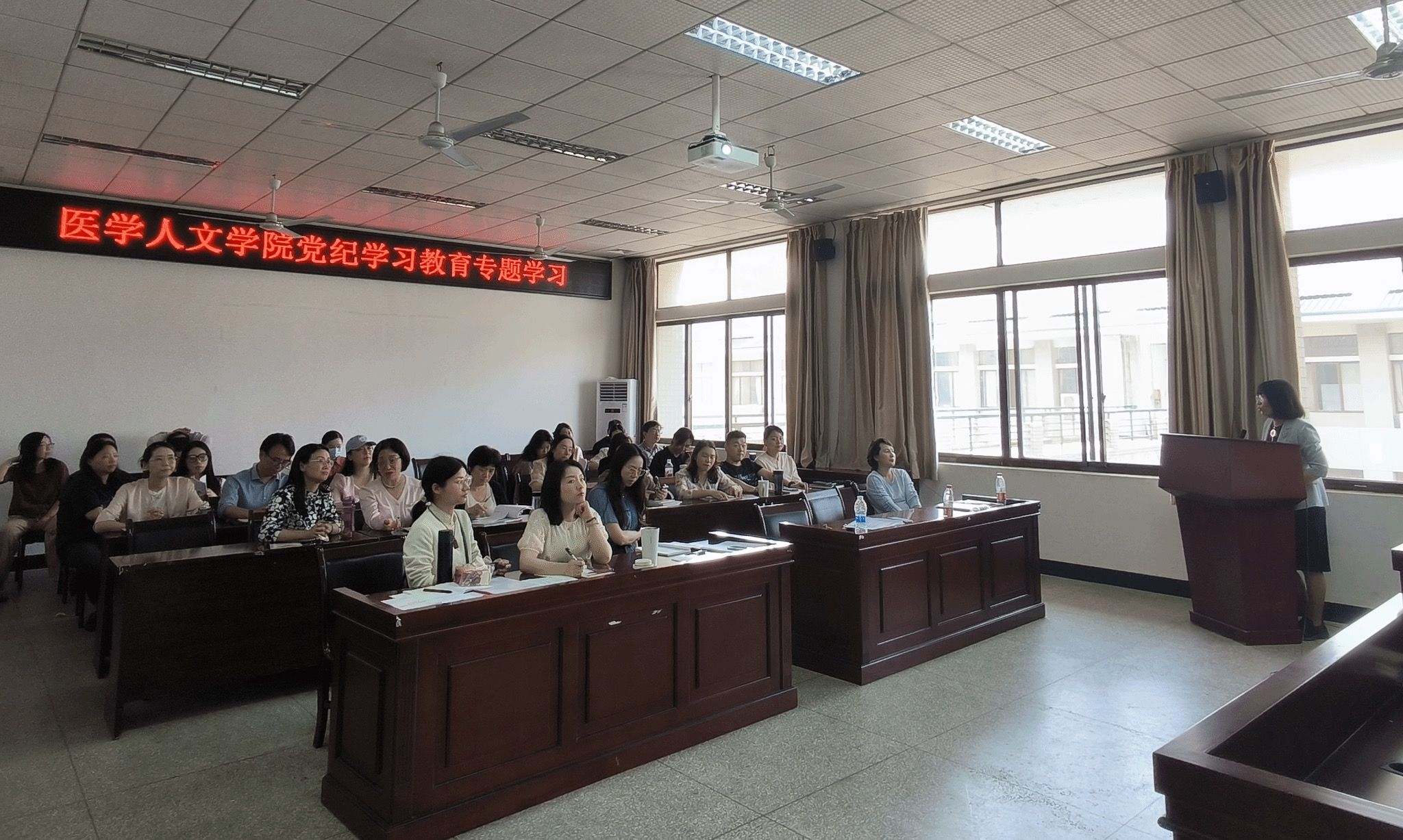 本网讯 为深入学习贯彻新修订的《中国共产党纪律处分条例》,进一步教育引导广大党员干部学条例、知敬畏、守底线,5月9日,医学人文学院党委启动党纪学习教育“周周学 周周练”系列活动。学院党委负责人主持活动,全体教工党员参加活动。