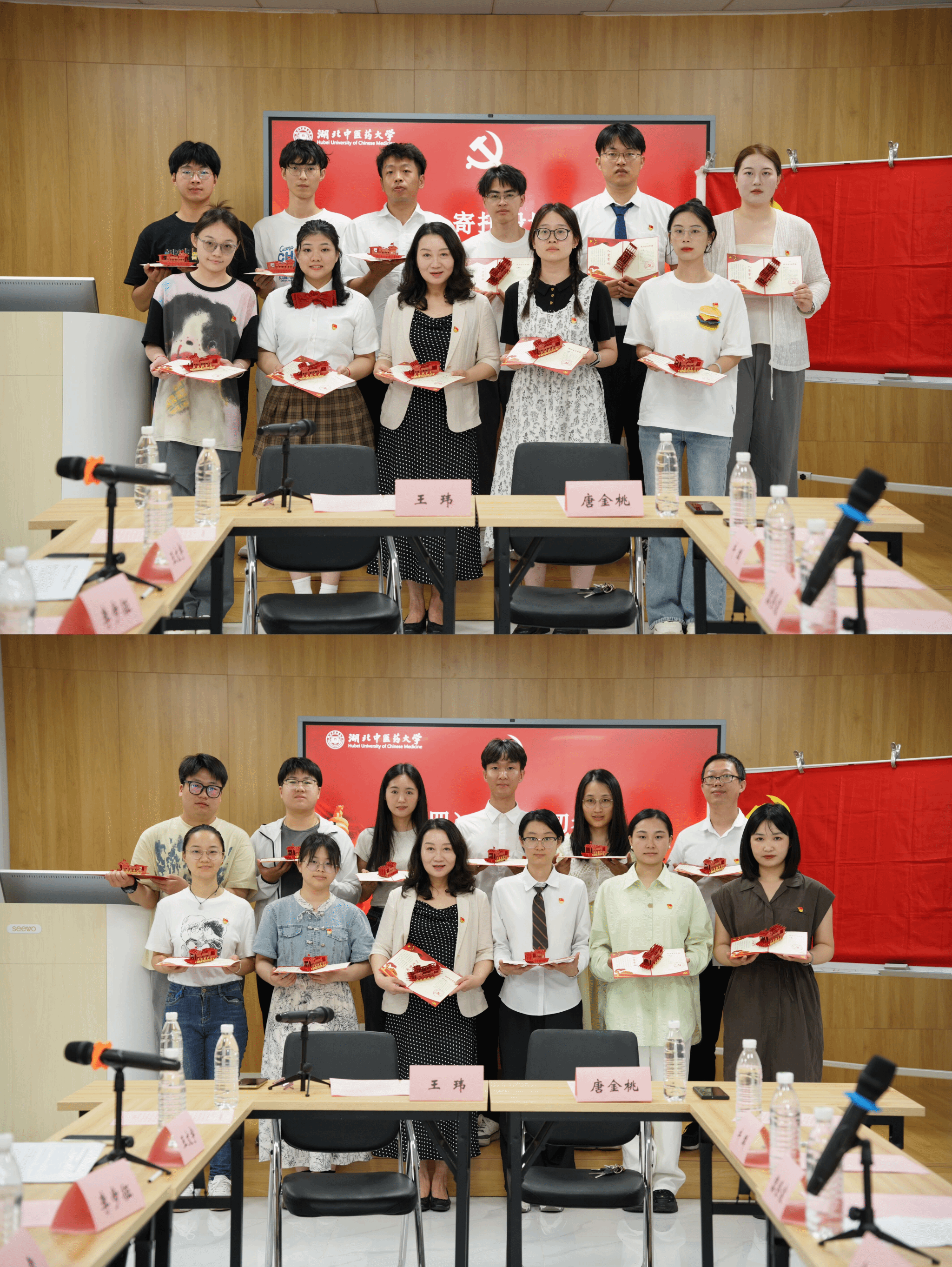针灸骨伤学院相关负责人向毕业生党员代表分别赠送《致2024届毕业生党员的一封信》和政治生日贺卡。贺卡上记录着党员的入党时间,印有“入党誓词”和象征着“红船精神”的立体红船,为毕业生党员留下一份深刻的“政治生日”印记。全体师生党员面向党旗,重温入党誓词,紧握右拳庄严宣誓。