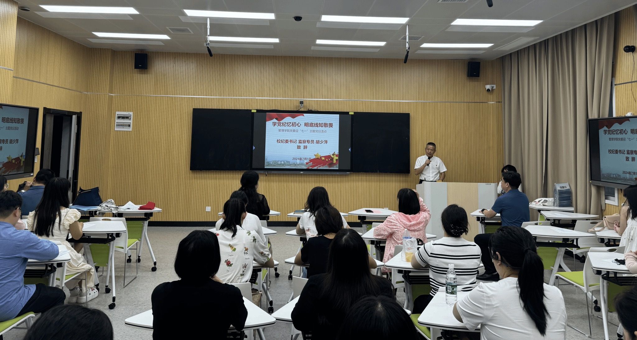 本网讯 为庆祝中国共产党成立103周年,持续推进党纪学习教育走深走实,7月1日,管理学院党委组织开展 “学党纪忆初心,明底线知敬畏”——“七一”主题党日活动。校党委常委、纪委书记 监察专员胡少萍,管理学院负责人、全体教职工党员和学生党员代表参加活动。