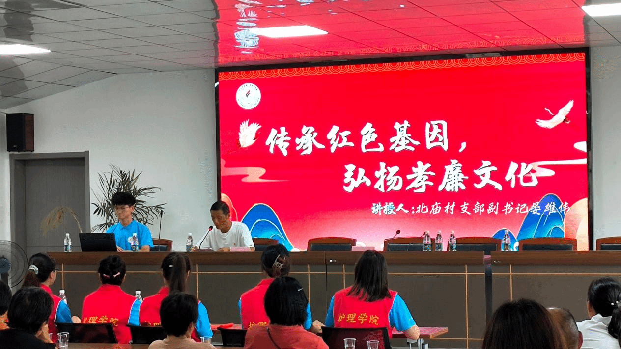 晏雄伟为大家讲授了“传承红色基因 弘扬孝廉文化”专题党课,结合丰富的历史典故,阐述了孝廉文化的内涵和价值。学生党员代表表演了《以孝为美、以廉为本》的朗诵,合唱了《没有共产党就没有新中国》和《团结就是力量》红歌,引导大家进一步加强党性修养、强化廉洁自律、弘扬新风正气,展现了护理学子听党话,跟党走的坚定决心。
