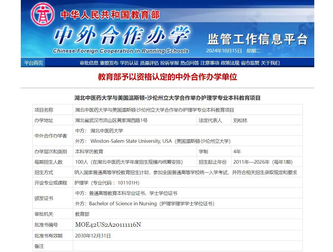湖北中医药大学与美国温斯顿·沙伦州立大学合作举办护理学专业本科教育项目办学资质